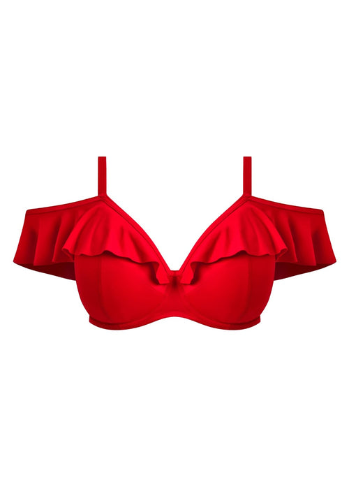 Voor een stijlvolle strandlook met comfort en steun kies je de Plain Sailing Plunge Shoulder Bikini Top in Lava. Deze plunge bikini top heeft smalle bandjes en een speelse volant die je zowel on- als off-shoulder kan dragen. De top is volledig gevoerd met een lichte en ondersteunende stof, voor een bikini-look met de pasvorm van een Elomi lingerie BH.